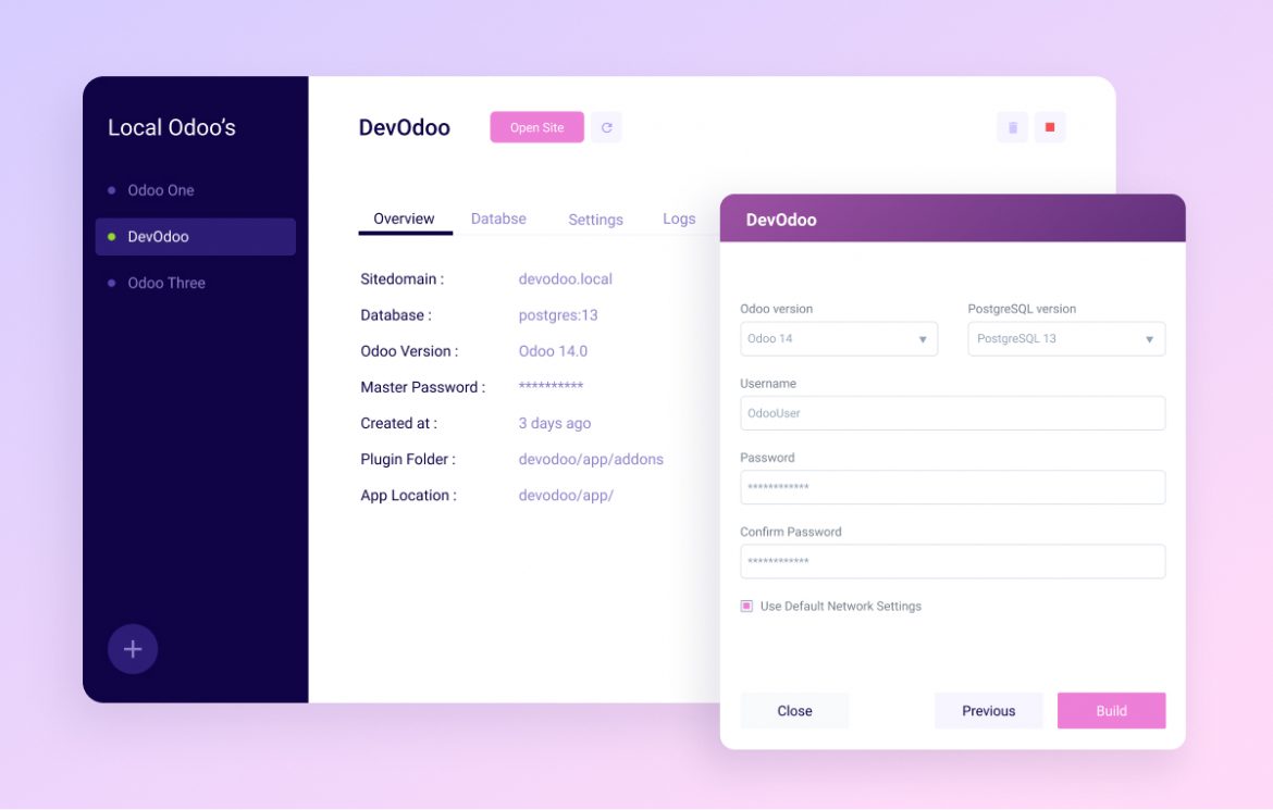DevOdoo يعتبر أول برنامج يوفر أسهل طريقة لتنصيب و إستخدام Odoo مباشرة من جهازك المحلي. مجاني ومتاح لأنظمة macOS و Windows و Ubuntu.